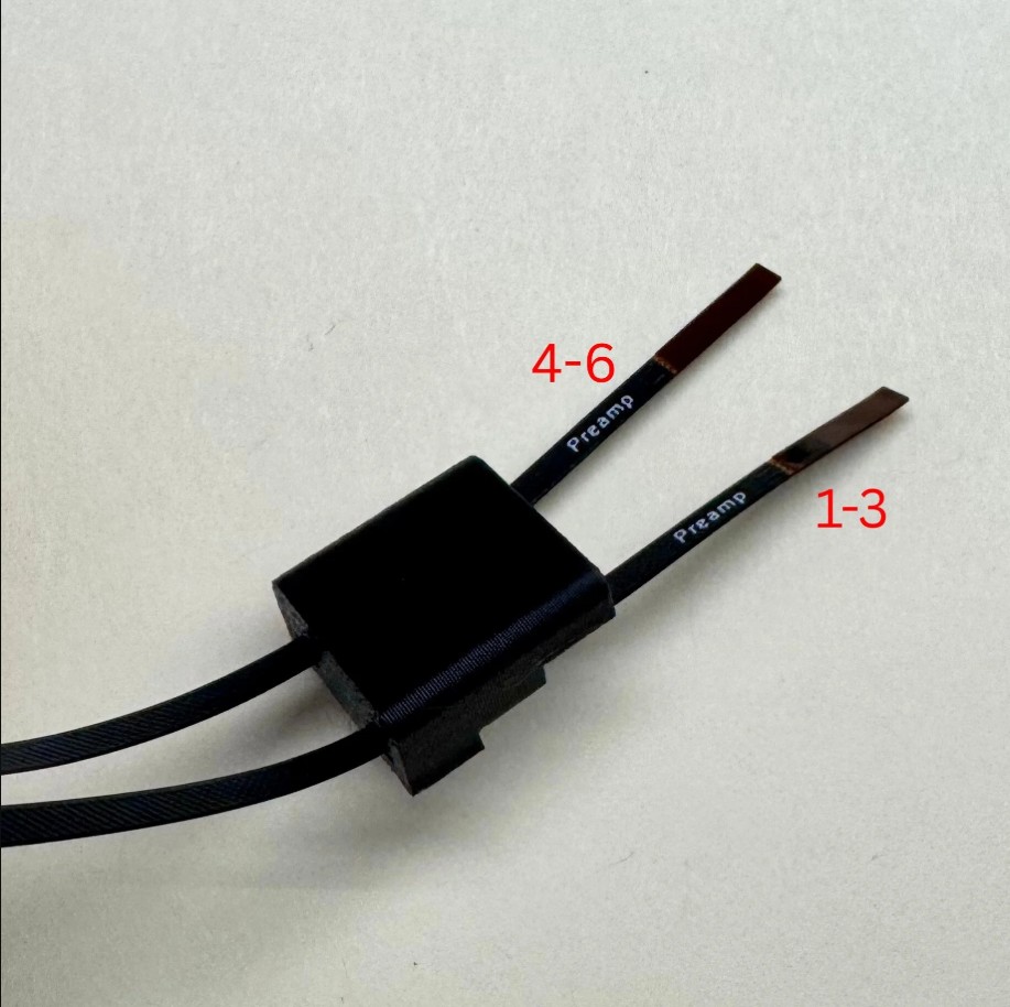 F. CAREFULLY insert the 1-3 cable (marked with permanent marker) into the preamp connector marked "1-3" and push the latch down with the sharp end of the Install Tool.