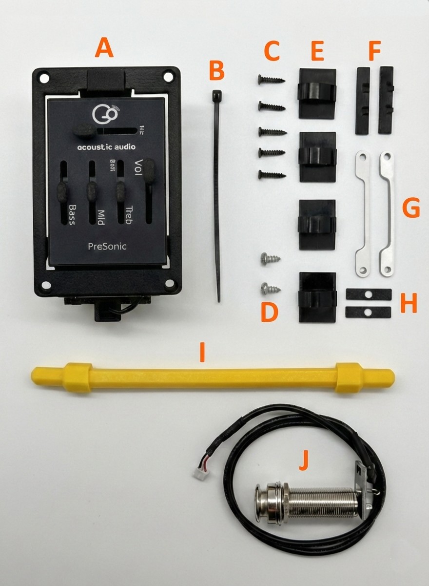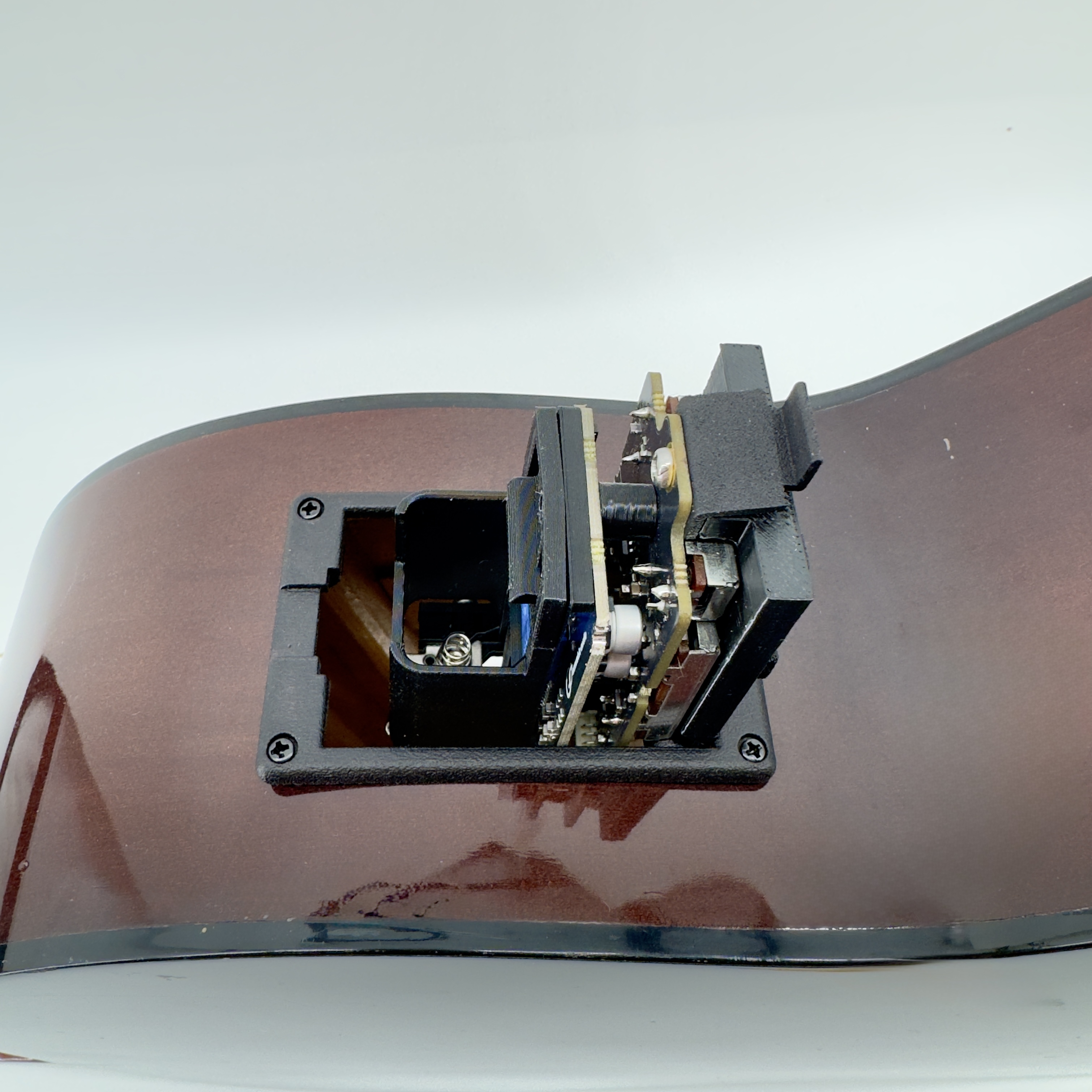 In this section, you will connect the Saddle-Pickup cables and jack cable to the preamp and then mount the preamp in the guitar.
