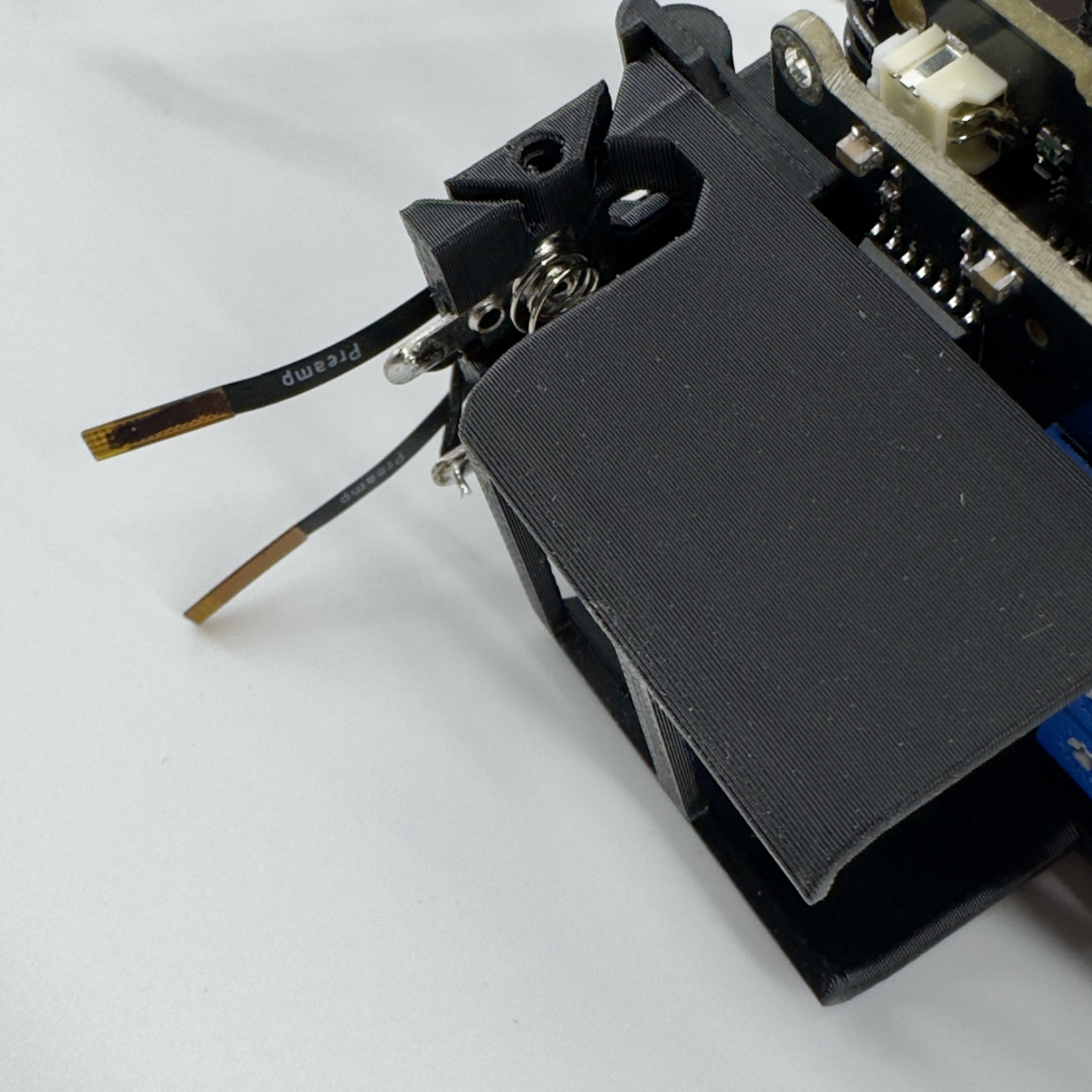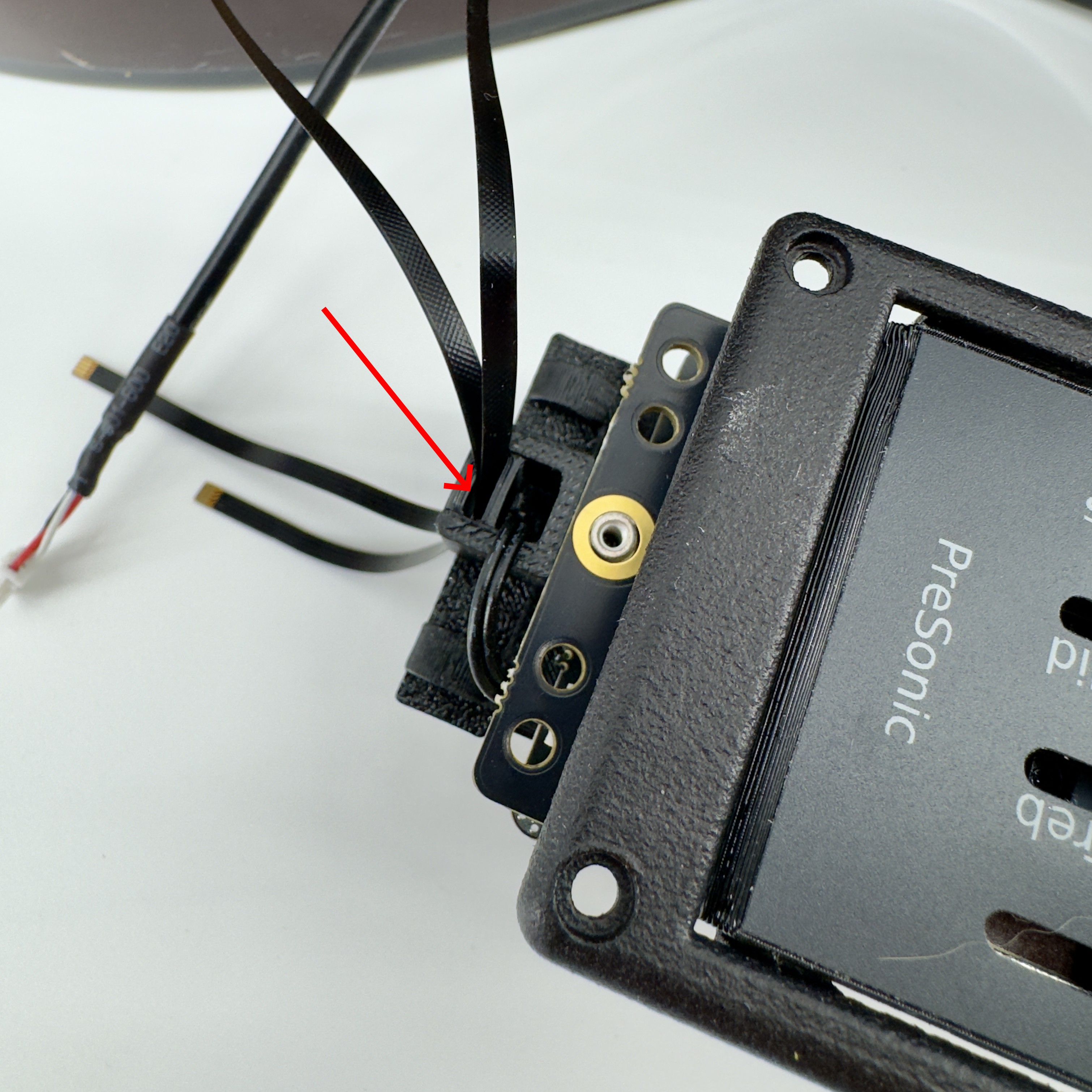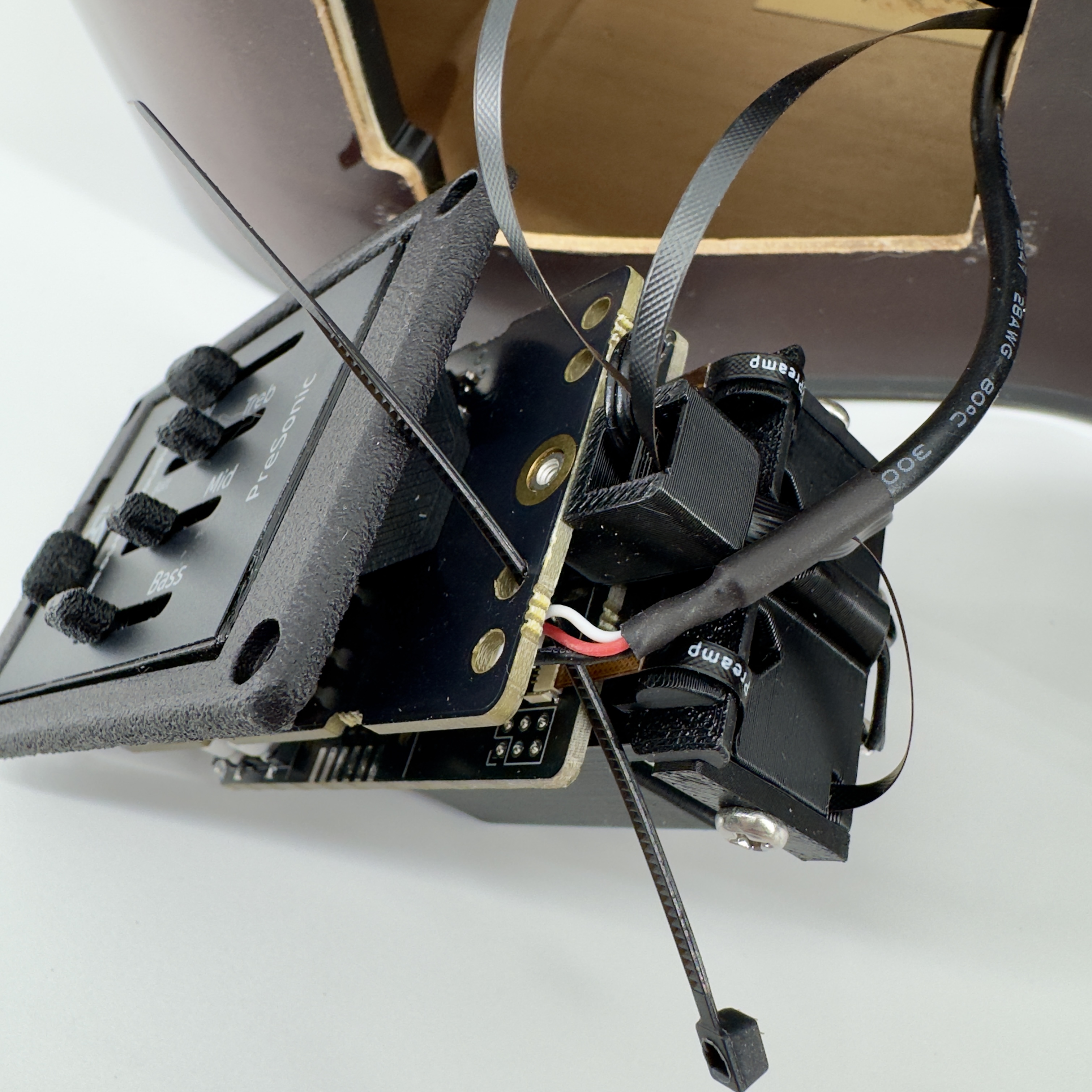Feed the Saddle-Pickup Cables through the small slot in the preamp as shown below. Make sure that the side of the cables with the word "Preamp" is facing the preamp.