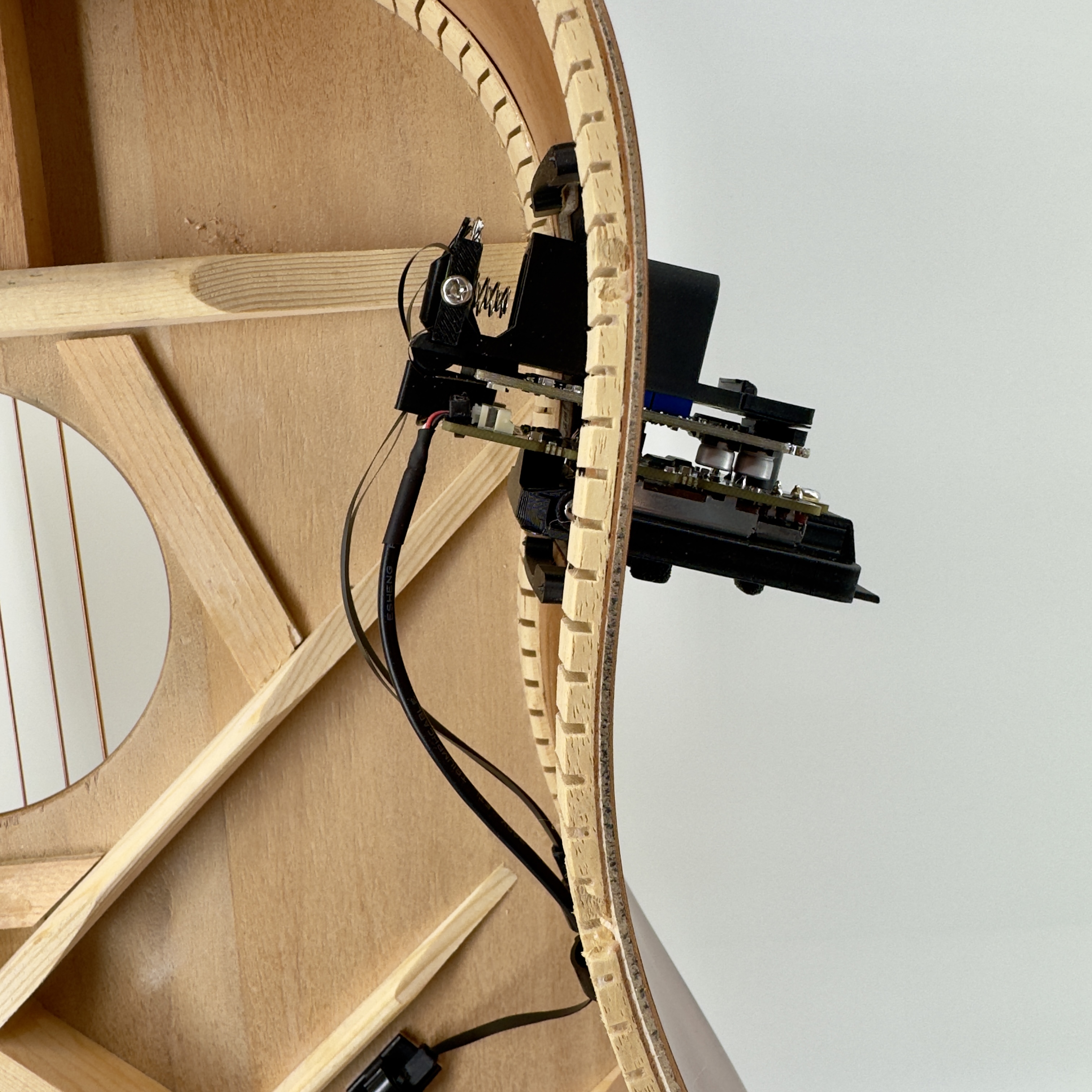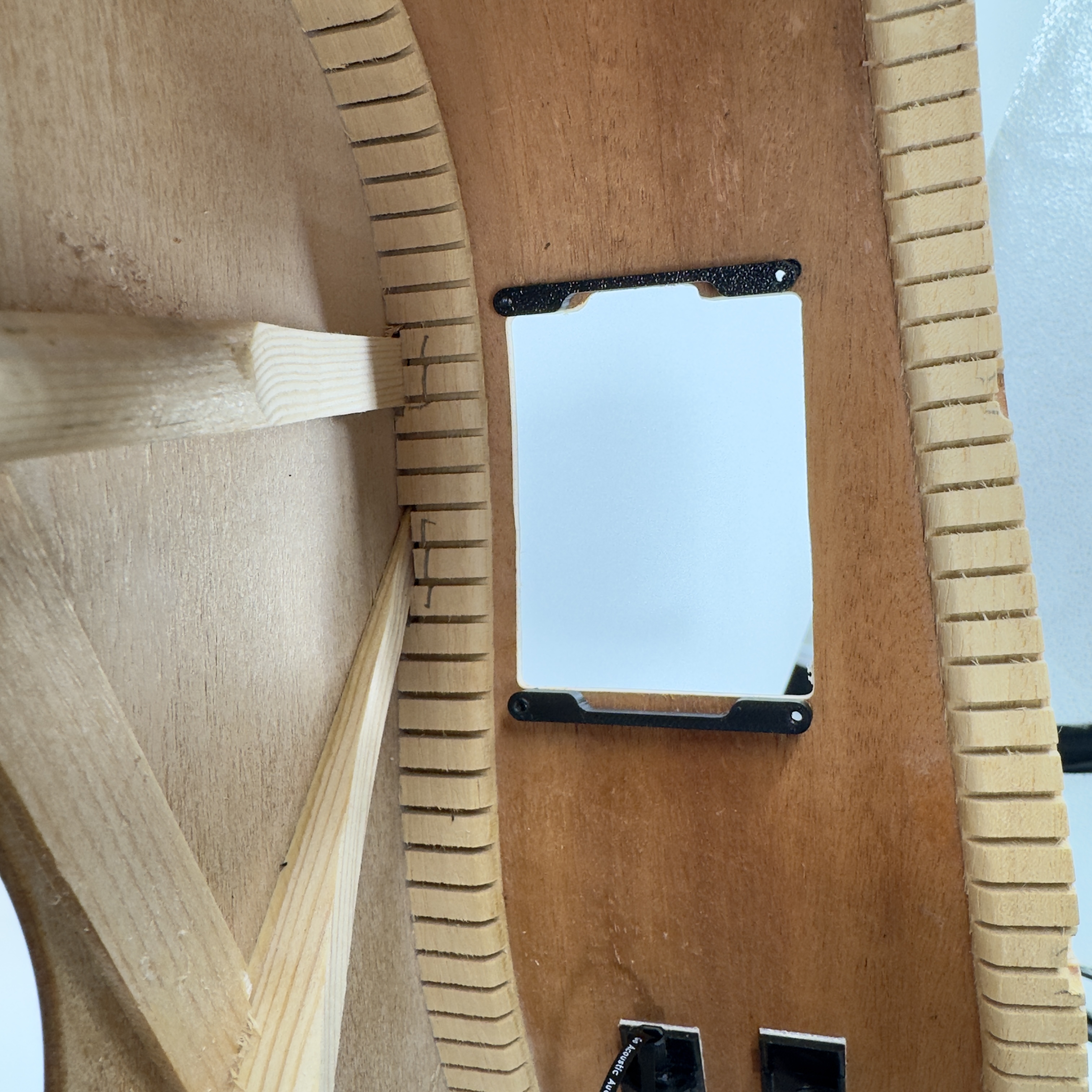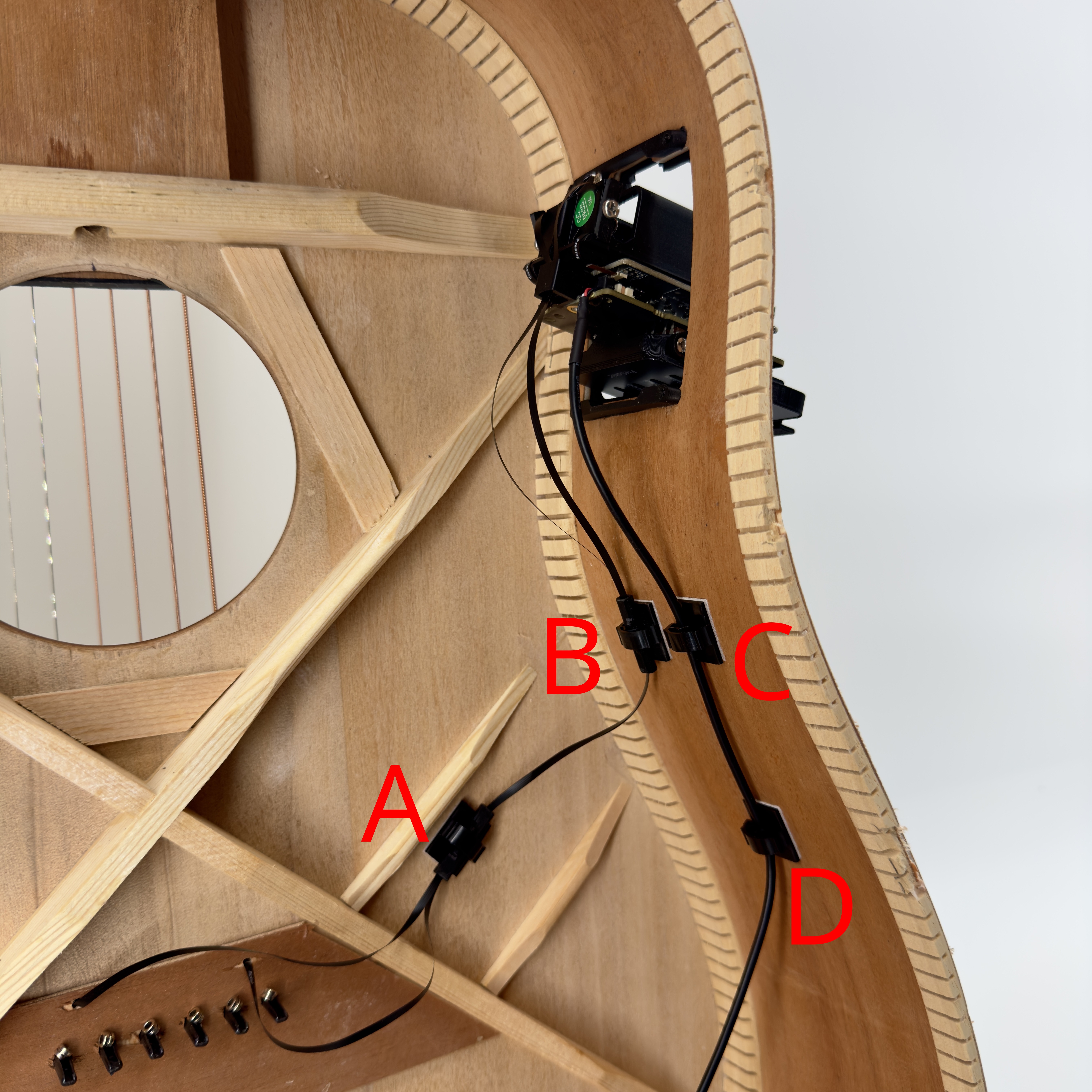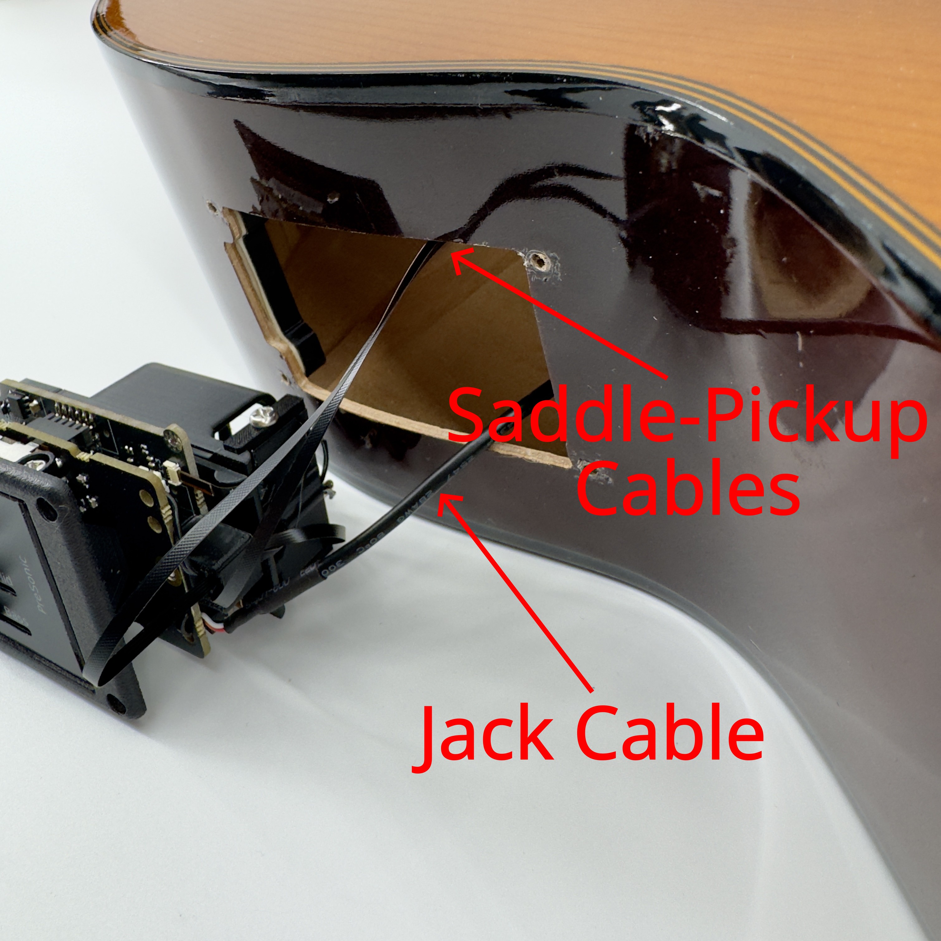 - Make sure the Saddle-Pickup is properly oriented with the connector access windows facing the sound hole.
