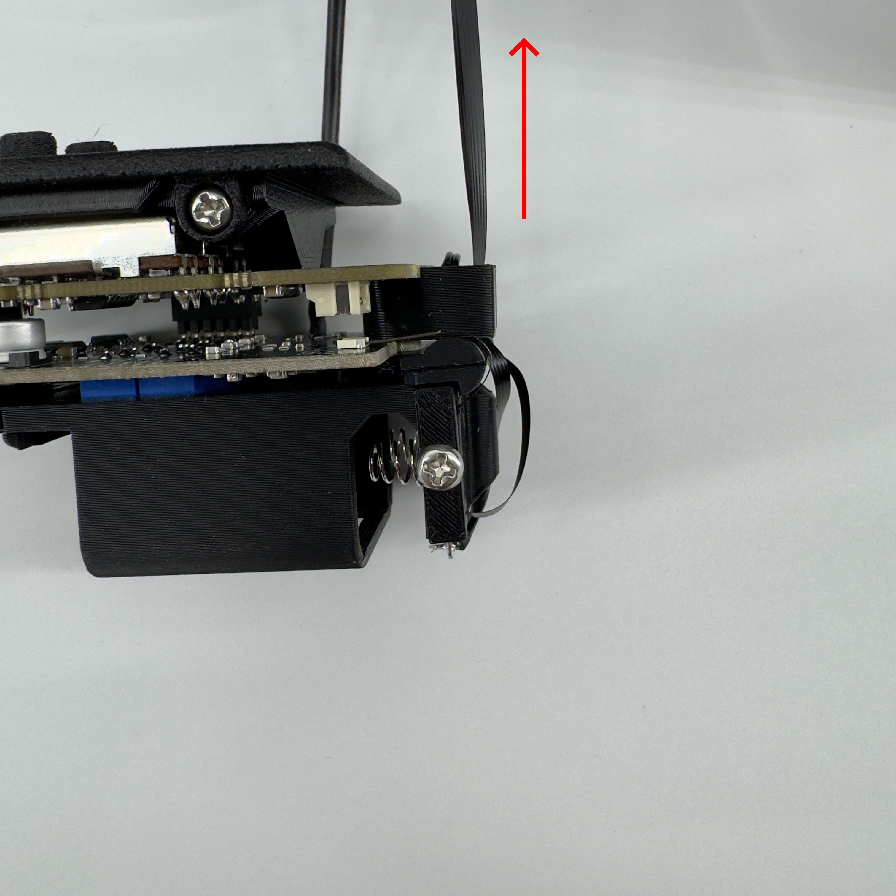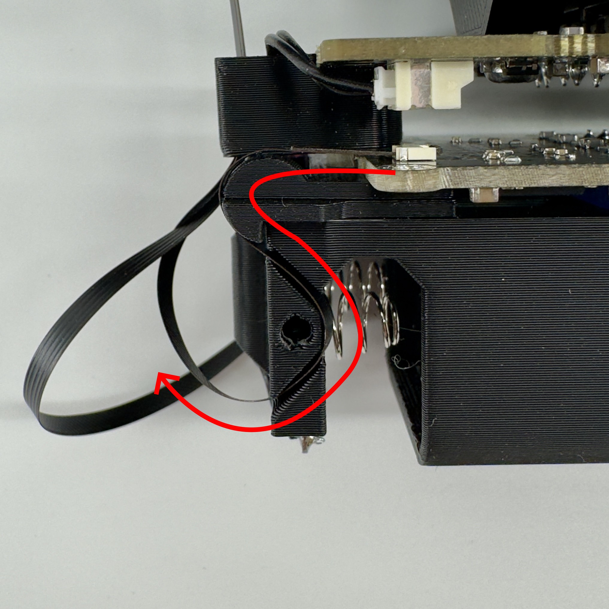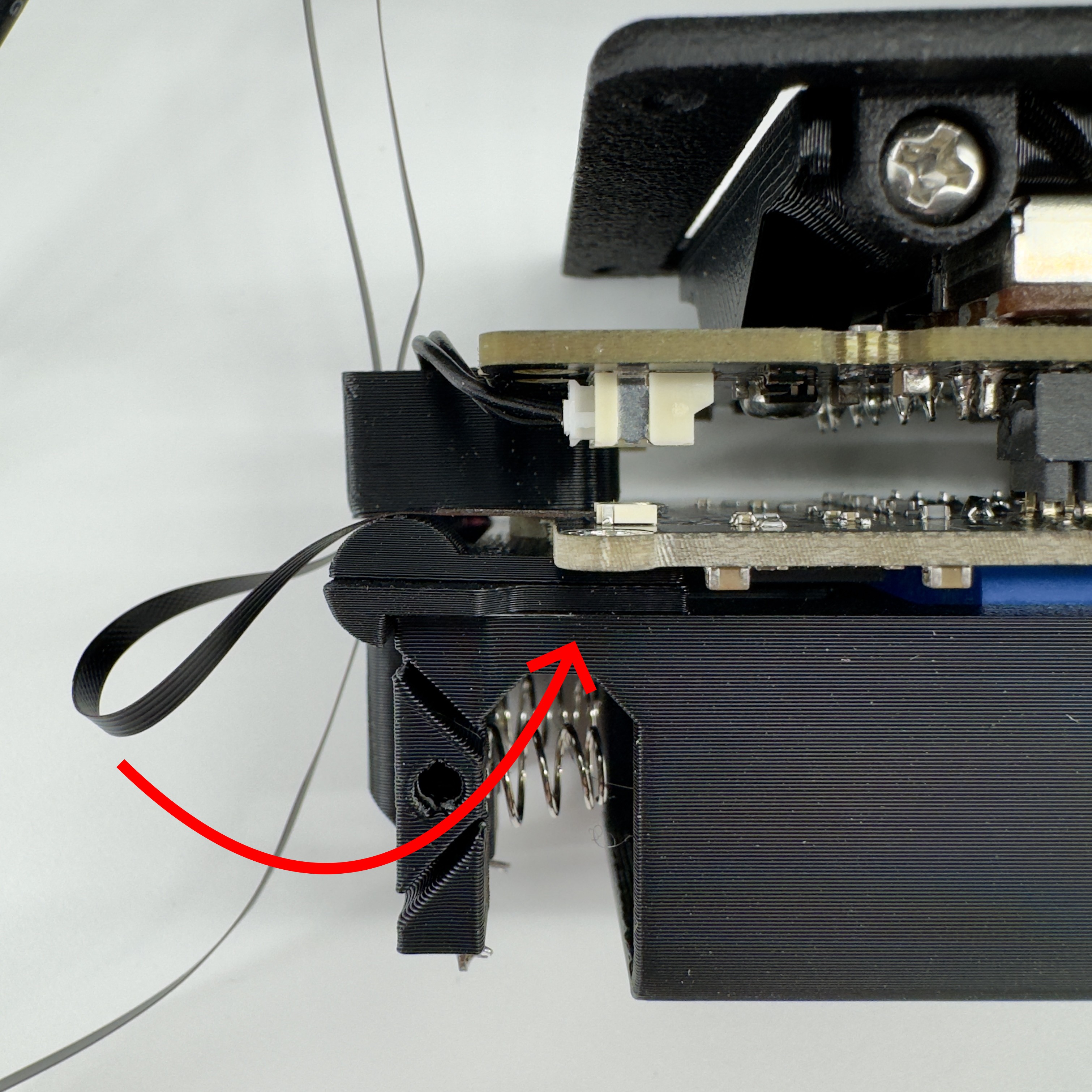 Carefully thread the cable through the slots in the side of the battery bracket as shown below.